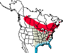 This family is found only in the New World. Vireos are small birds that move about slowly and deliberately as they glean insects from foliage and twigs. Their bills are cylindrical, with a slight hook at the end. These bills are relatively large for birds their size, which enables them to eat fairly large insects. Most vireos are drab colored, with olive-green or yellow upperparts and lighter olive or buffy underparts. Many have eye-rings, eye-lines, or wing-bars. In Washington, vireos with wing-bars have eye-rings, and those without wing-bars have eye-lines. Vireos are often hard to see as they forage in high or thick foliage, and when found are generally alone or in pairs rather than in large flocks. Most have fairly simple songs that they sing repeatedly, many singing through the entire day and even while on the nest. Nests are generally suspended from small horizontally forked branches. Pairs are monogamous, and both parents raise the young.