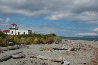To reach Point No Point, take the Kingston Ferry from Edmonds, just north of Seattle. (See References below for ferry information.) After leaving the ferry dock, drive two+ miles on Route 104 to a major intersection. Go right on Hansville Road NE for about seven miles. Just before reaching the water, bear right on Point No Point Road to the lighthouse, passing homes, a boat rental business, and trailer park en route. Parking is available at the lighthouse, and there are well-maintained port-a-potties near the parking lot. Be sure to respect private homes.